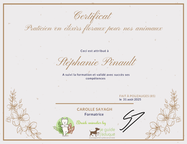 Afin d'offrir le meilleur à votre compagnon et pour vous donner les conseils les plus pertinents pour ce que vous vivez, je me forme régulièrement :